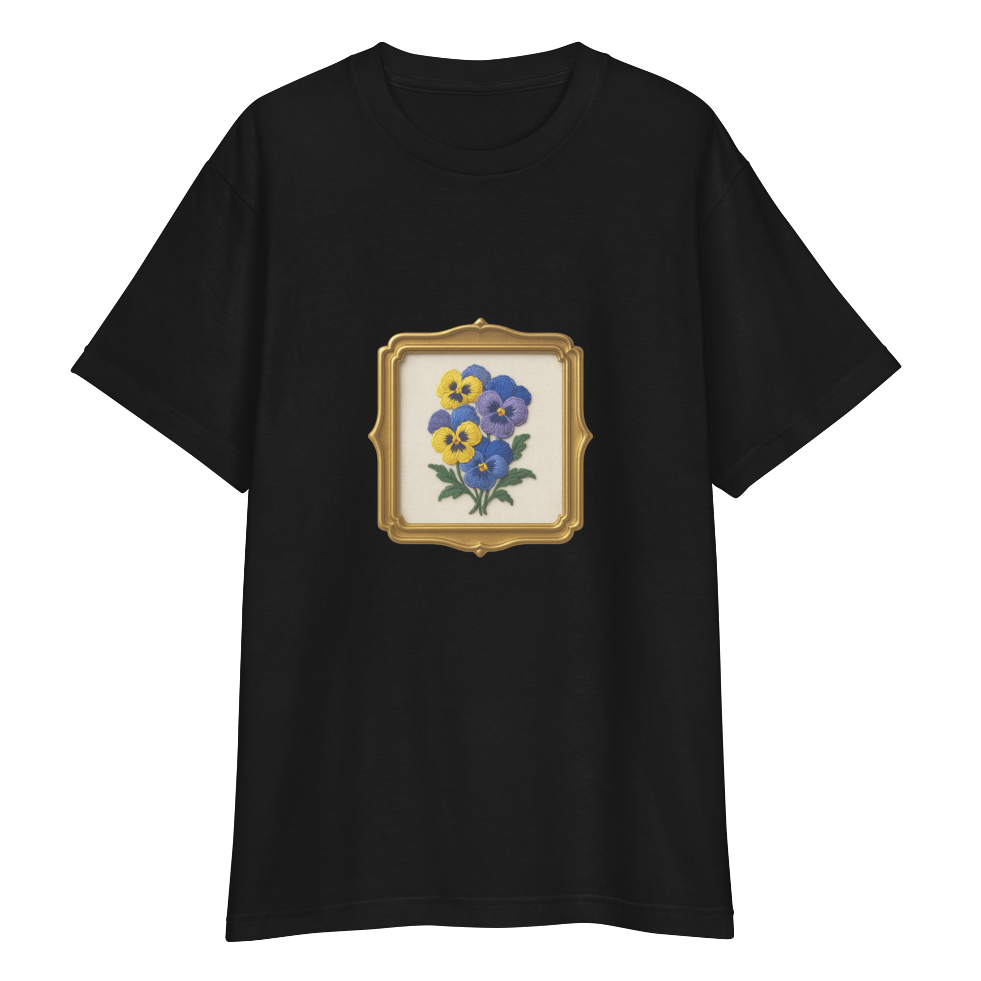 刺繍のようなパンジーが、額縁の中に可憐に咲くクラシカルな一枚。