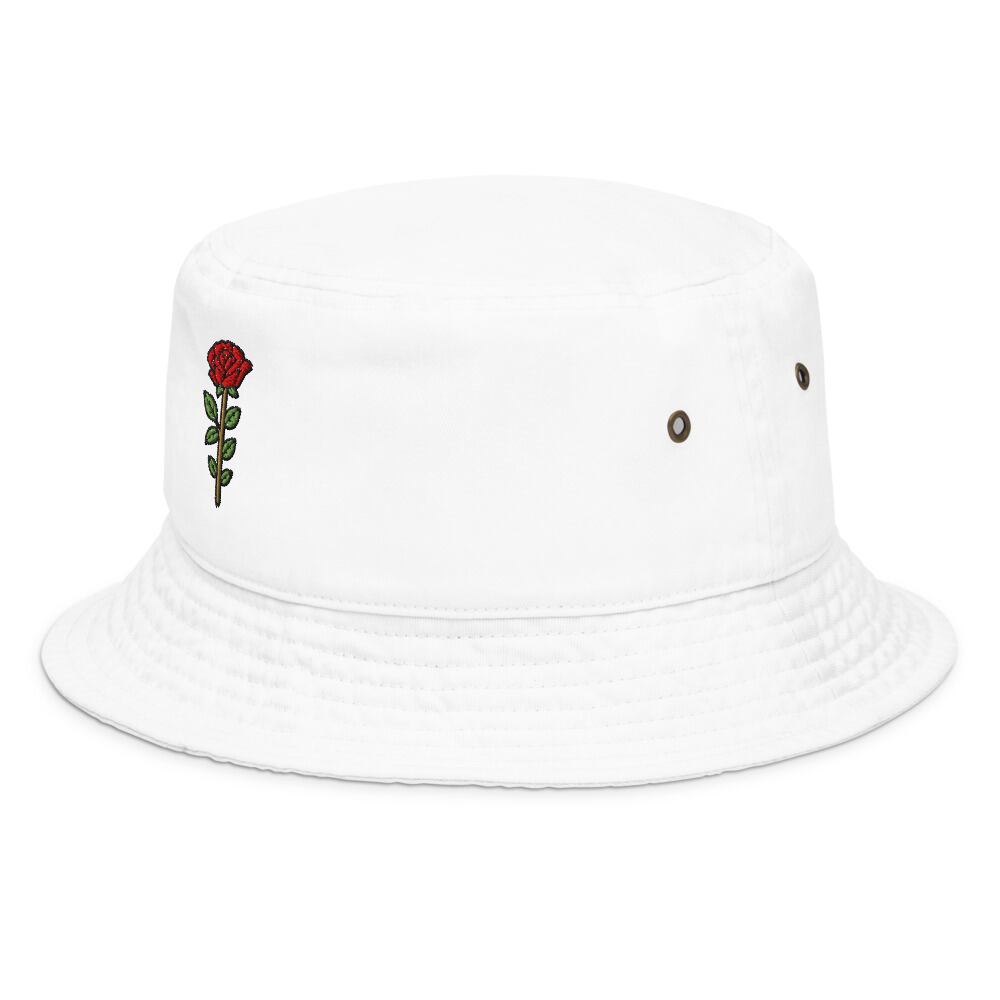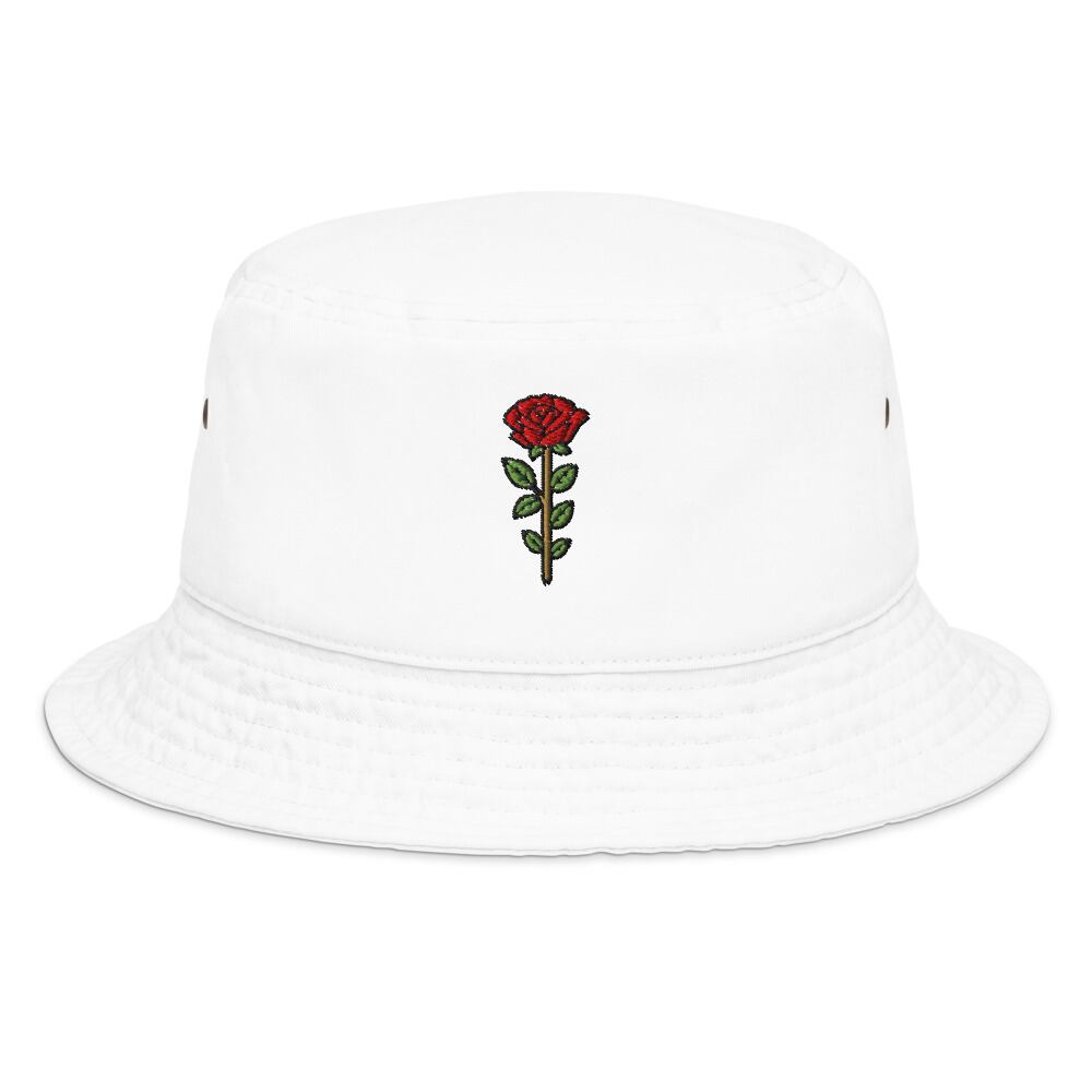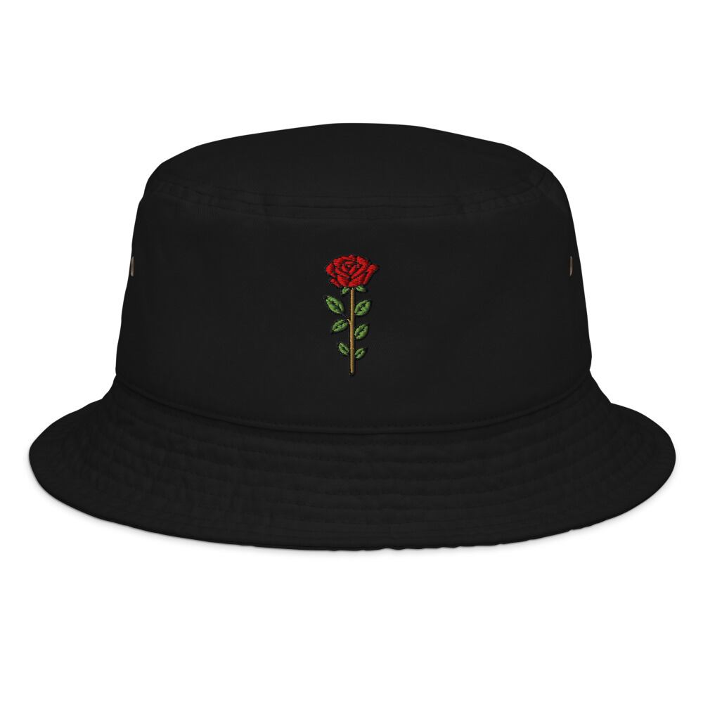 中央に咲く赤いローズが、シンプルなシルエットに華やぎを添えるデザイン。