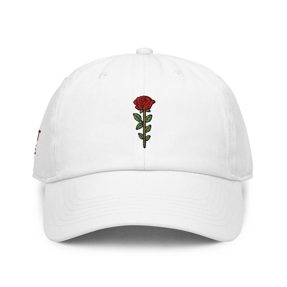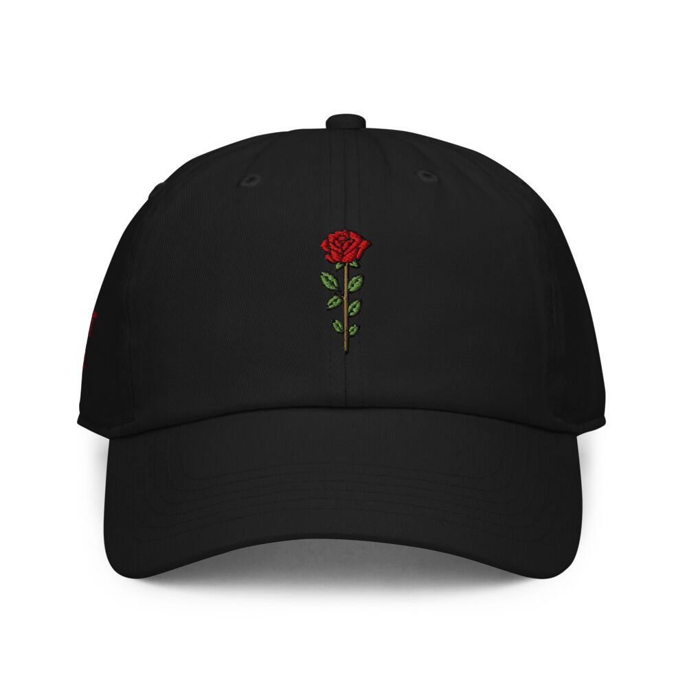 正面に咲く一輪の赤いバラが、控えめながら印象的なワンポイント。