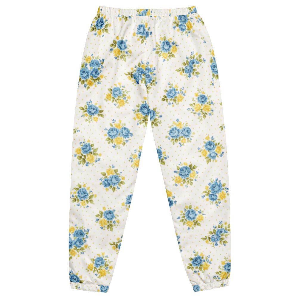 ブルーとイエローのバラがふんわり咲き誇る、優雅な総柄パンツ。