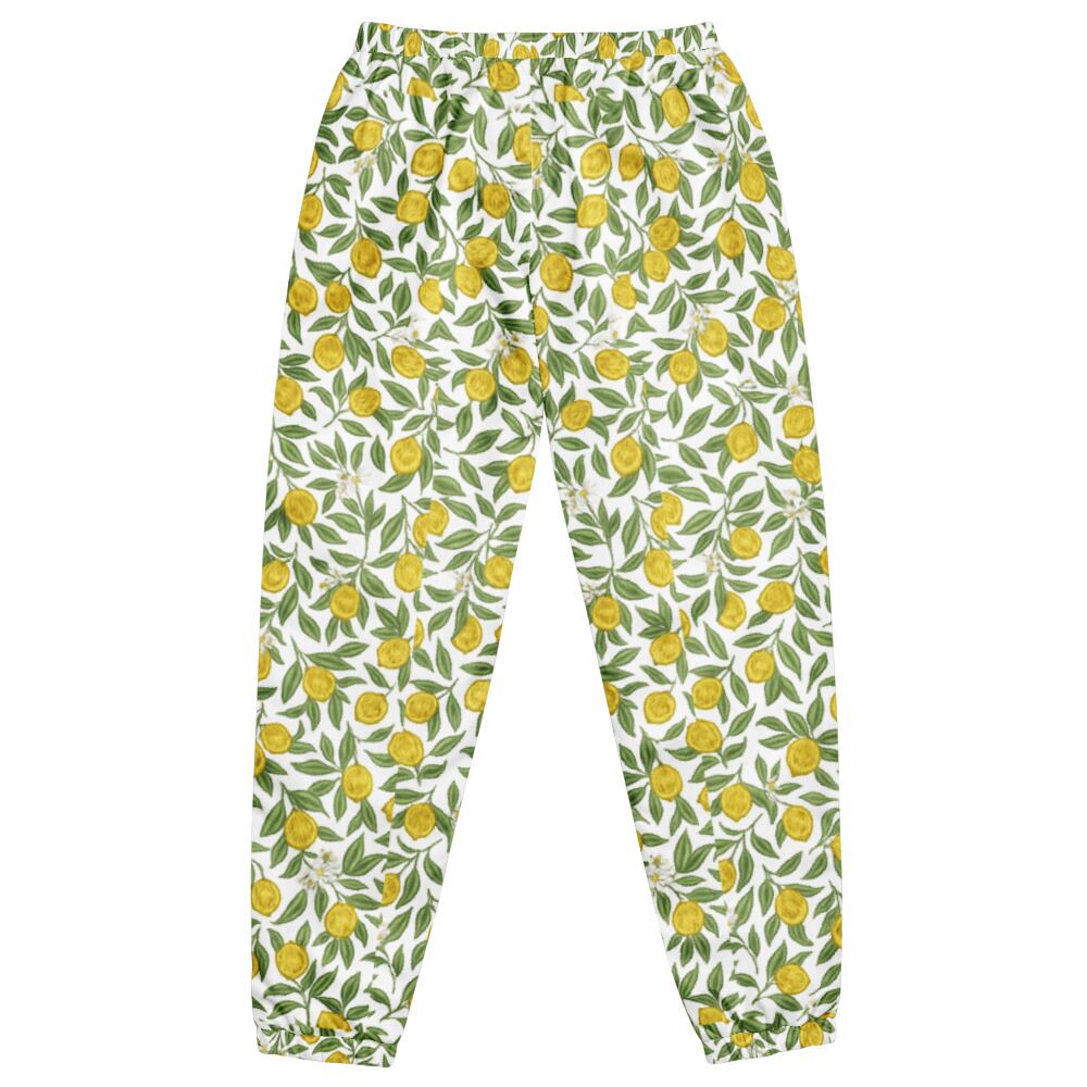 葉の間から顔を出すレモンが、リズミカルに散りばめられた爽やかな総柄パンツ。