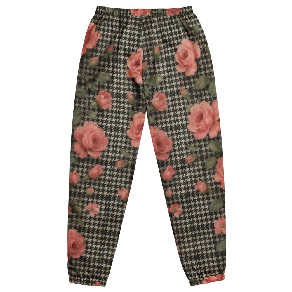 千鳥格子のクラシカルな柄に、くすみピンクのローズが重なる印象的な一本。