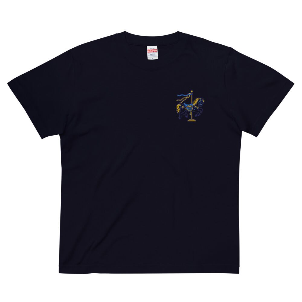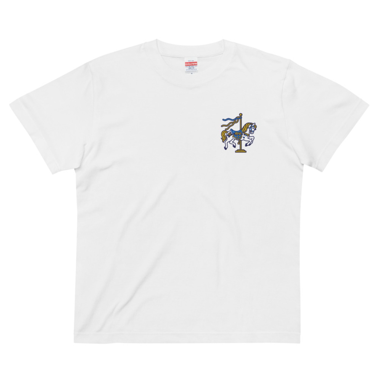胸元にあしらわれたメリーゴーランドの馬が、静かに夢の世界へ誘うような一枚。