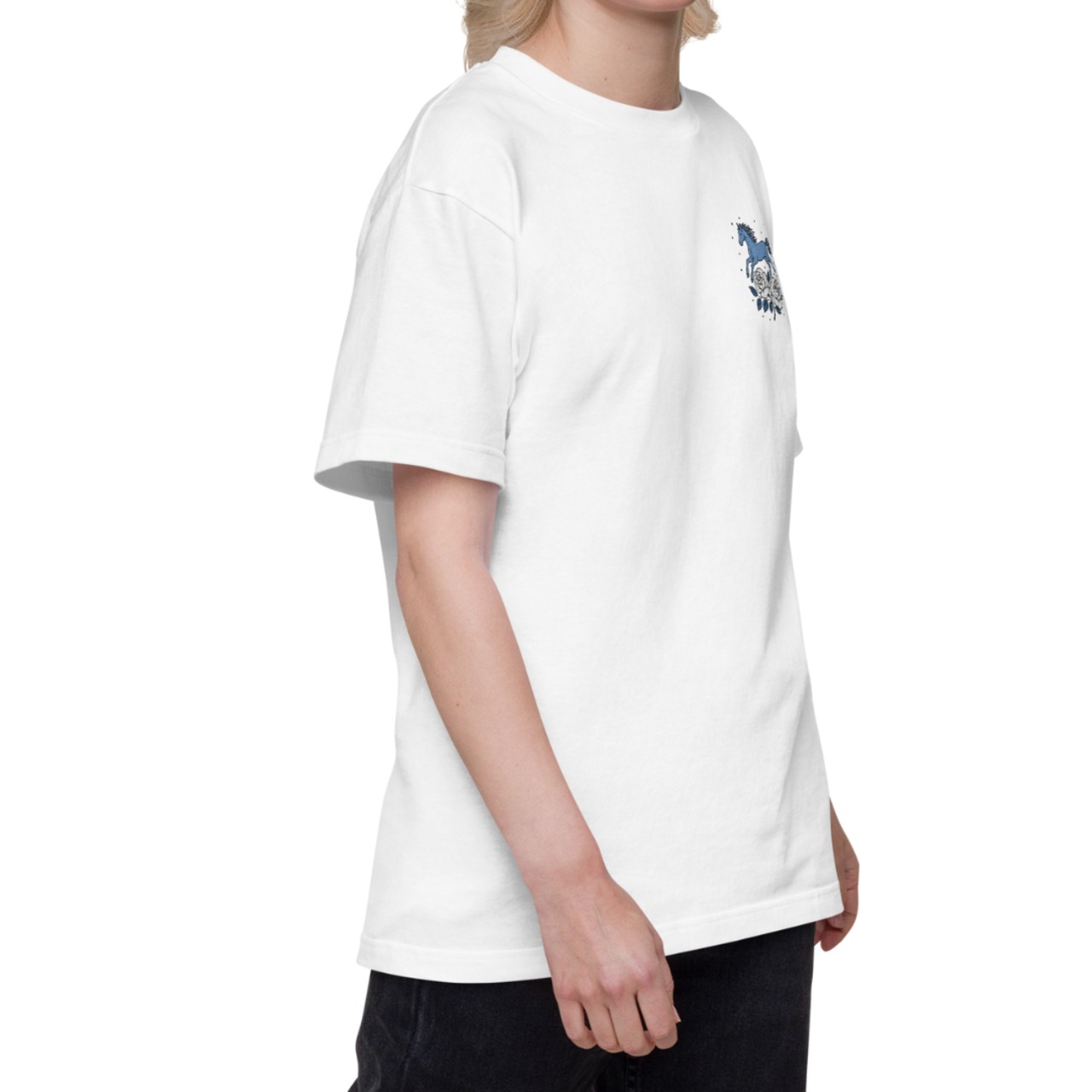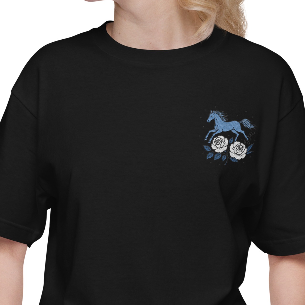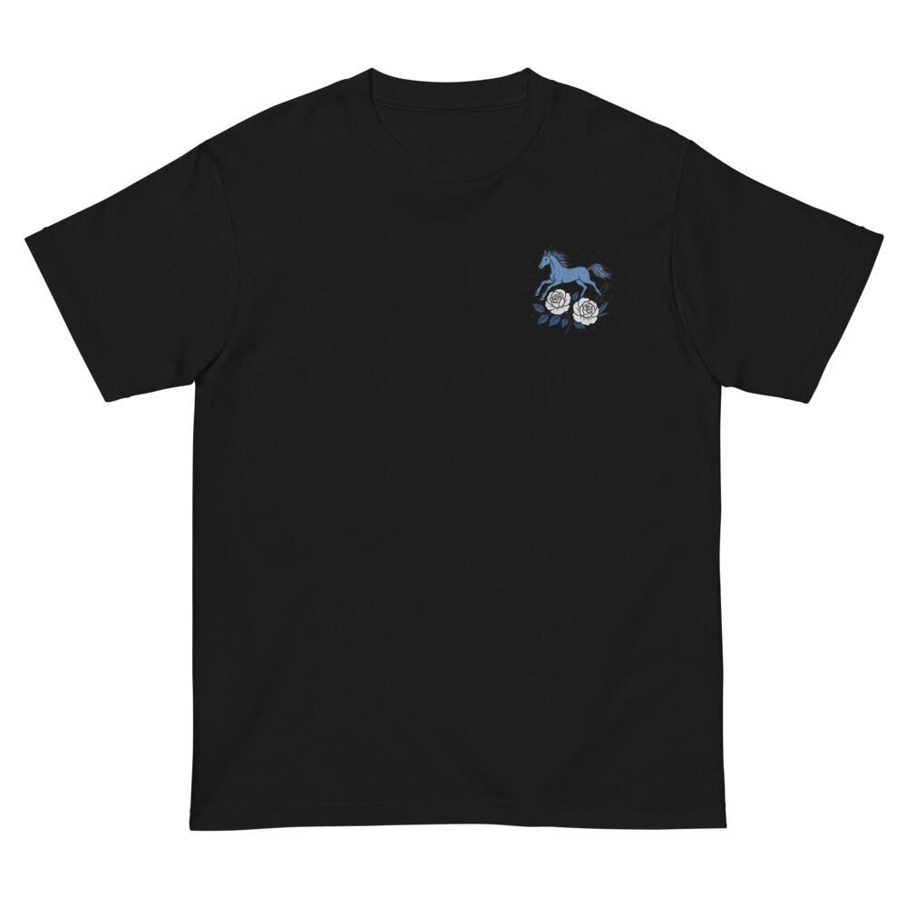 青い馬と白い薔薇を胸元にあしらった、ジャルダンスクレの刺繍Tシャツ。