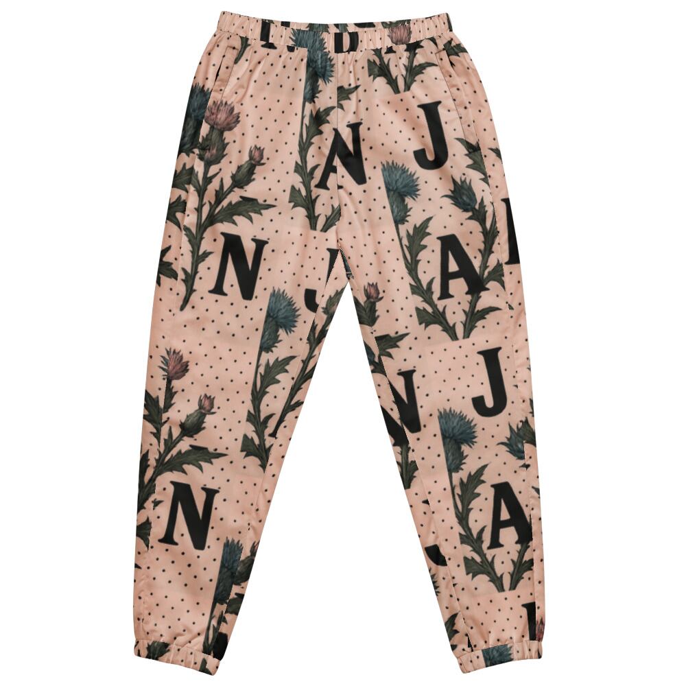 淡いローズピンクのベースに、アザミの花とドット、そして意味深なレタリング。