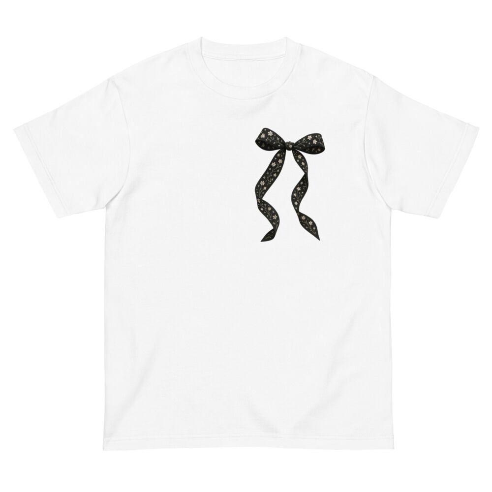繊細な黒いリボンモチーフを胸元にあしらった、上品なワンポイントTシャツ。