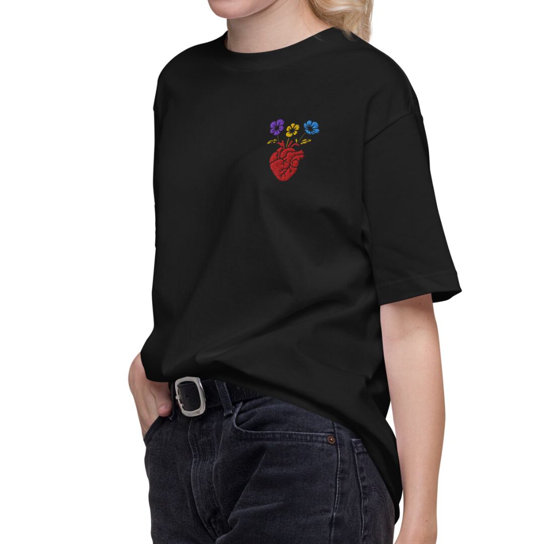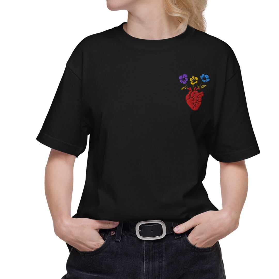 解剖学的な心臓からパンジーが咲きこぼれる、印象的なモチーフを刺繍で丁寧に表現しました。