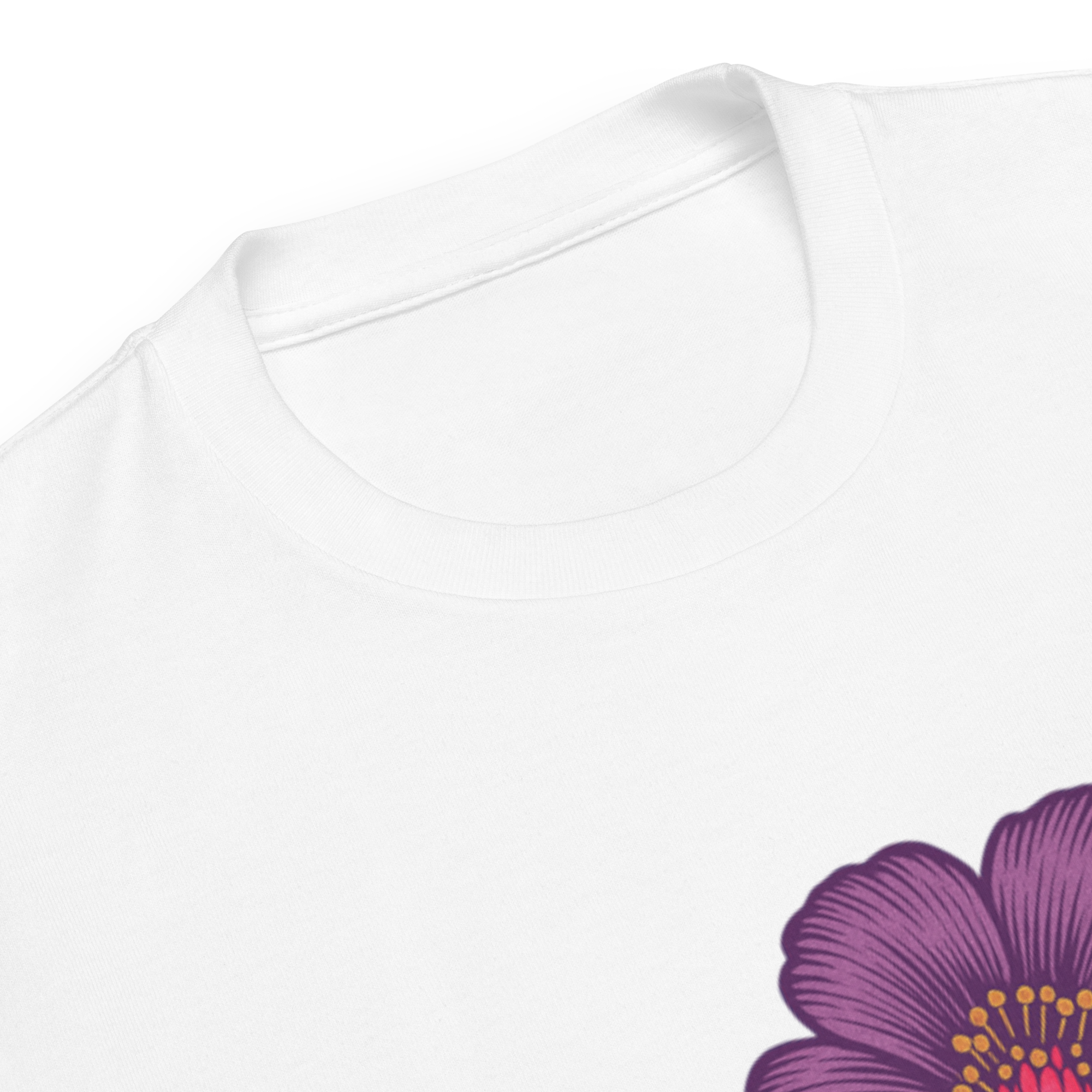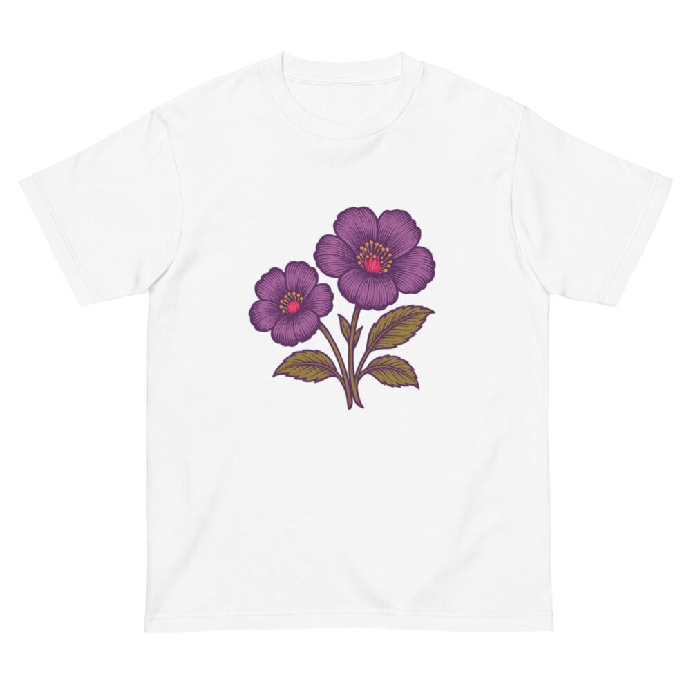 手描き風の優しいタッチで描かれた、紫のフラワーが胸元に浮かぶオリジナルTシャツ。